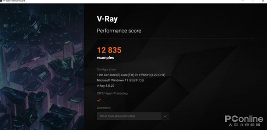 VrayBenchmark是Vray渲染插件的性能测试工具,实测该机的i9-12900H可达12835vsamples,比AMD5900HX版提升34%的性能。