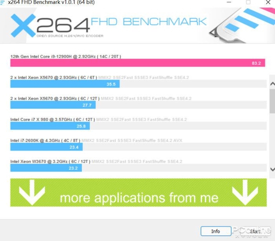 X264Benchmark是X264视频编码测试程序,从结果来看,ProArt创162022搭载的i9-12900H每秒可渲染83.2帧,较AMD5900HX版本性能提升约33%。