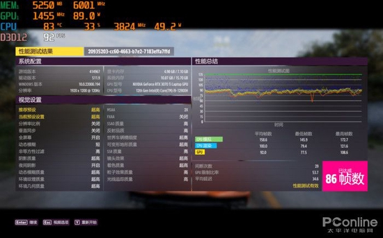 在”超高”画质,1080P分辨率下,平均游戏帧数可达86FPS。