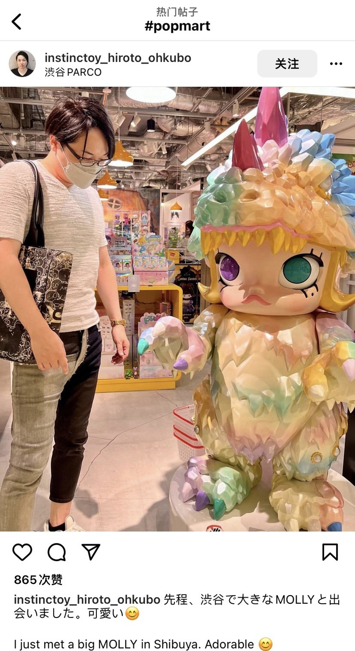 过去两年,泡泡玛特在涩谷Parco开设的快闪店同样吸引了很多当地人前来打卡,日本知名潮玩设计师大久保博人也在个人Instagram上传了自己与巨型Molly的合影。