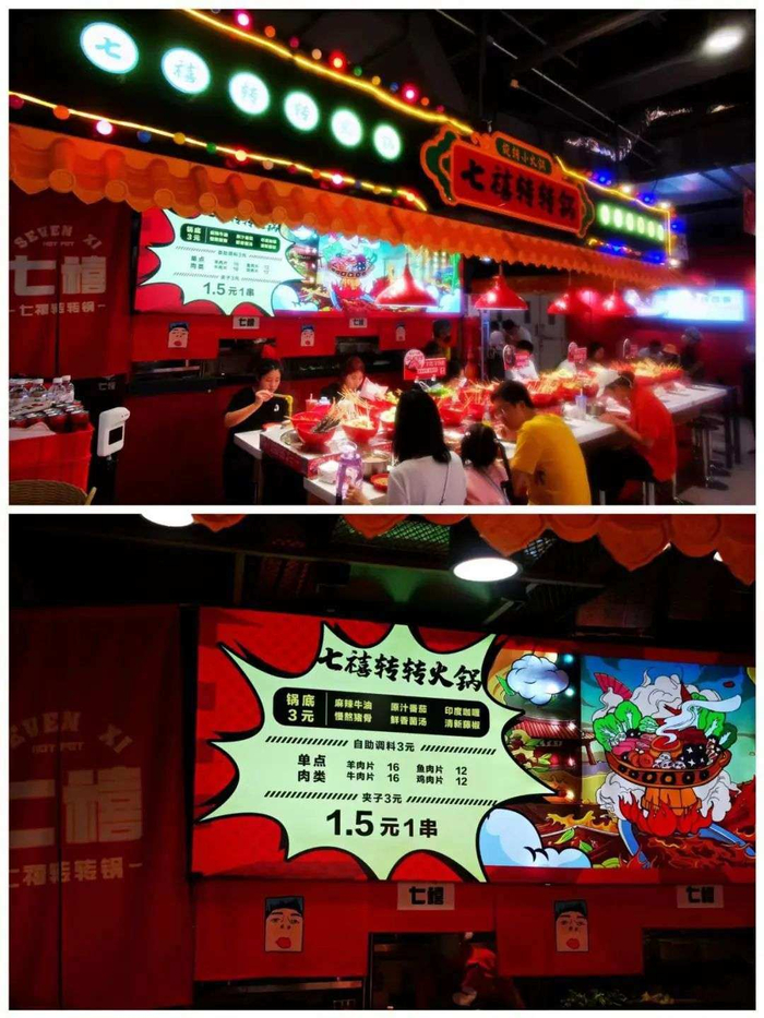 另一家店是位于长楹天街负一层的“七禧转转锅”,类似于“串串香”的模式,“1.5元/串”+“3元/位”的锅底,其他如牛羊鱼肉类则需单点,整体人均在20-30元,午市上座率大约有六成,晚市需排队。
