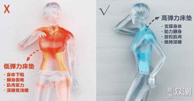 像成年人正常睡眠时每晚平均会翻身20-30次,很多时候,我们越睡越累,主要就是翻身时肌肉产生的疲劳感。但如果床垫有恰到好处的回弹力,翻身就会省力很多。