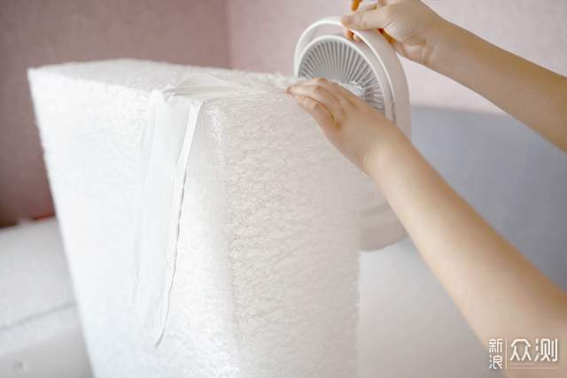 我还做了个透气性测试,把电风扇开到最大档位,隔着20cm厚的芯材吹对面的纸巾,居然被轻轻吹起来了!