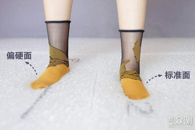 每块芯材上都有标注1、2、3的数字,分别代表偏软、标准、偏硬。图中是我踩在偏硬和标准力度的芯材上,可以看到支撑性都不错,除了落脚点处,周围完全没有任何凹陷。