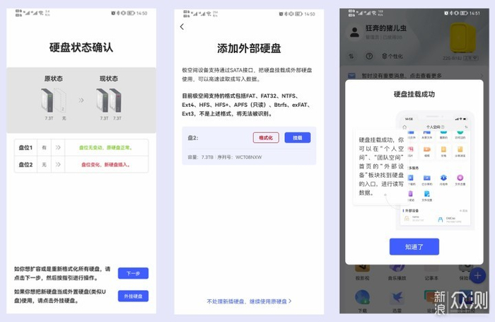 除了USB拓展之外,如果你是以单硬盘模式在使用Z2S,另外一个盘位你后期想要挂载一块新的硬盘但是你又不想格式化这个硬盘的内容那也是没问题的,前提是对挂载的硬盘分区格式有要求,实际体验了一下,其实支持挂载的硬盘格式覆盖面非常多的,主流的Windows、Linux以及MacOS系统分区的部分格式都支持。
