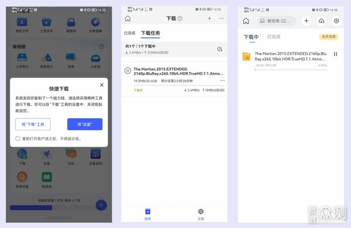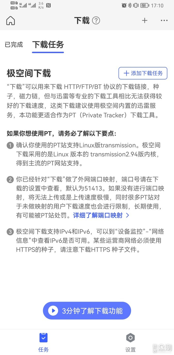 Z2S在这方面有三大法宝:自己的“下载”应用、接入迅雷、支持百度网盘。一周多的体验下来我发现极空间APP有一个非常大的特点就是所有功能都有详细的使用介绍,虽然你会觉得它功能繁多,但是厂商做到了多但不乱,各个功能使用说明写的非常详细,一目了然。“下载”功能也不例外,打开它就会出现一个使用详细的功能使用说明,并且也做到了你复制这类下载链接打开极空间APP后自动识别逻辑,交互体验方面拿捏得恰到好处。