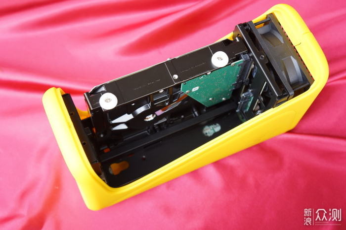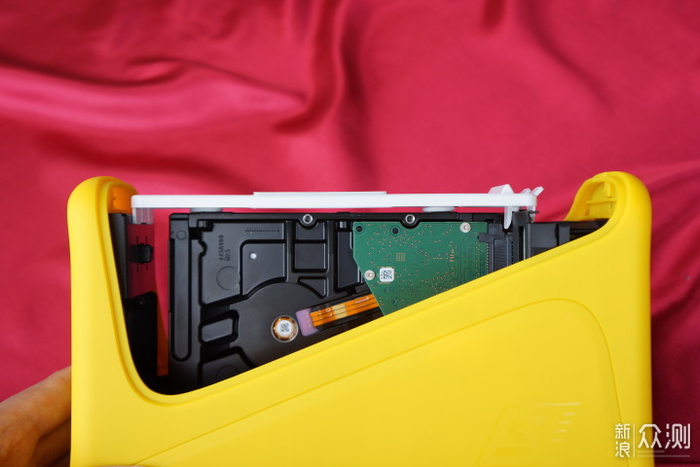 硬盘装进后的状态,顶部还是有一块相对来说比较厚实的塑料条来进行进一步的固定和保护硬盘的。