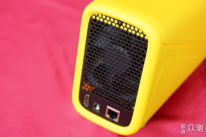 在硬件布局方面,从后侧可以看到一整块金属防护网罩着一块硕大的尾部风扇,透过风扇看到了目前还空空如也的Z2S的肚子静静的等待着硬盘的到来;视线来到机器底部,除了四个脚垫和产品铭牌之外,最抢眼的还得数大面积的底部散热开口,这也是主机的出风口,凸起的脚垫使得散热开口和桌面有一定的空间冗余,方便快速排出内部的热量。