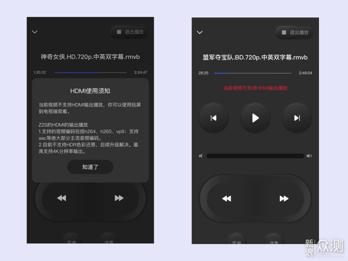 不过与Z2S本身强大的视频解码能力相比,HDMI直连支持的视频格式就不太多了,目前测试MKV、MP4等格式支持是OK的,但非常常见的RMVB却不支持有点遗憾,希望厂家在之后的产品软件迭代上能够适配上。