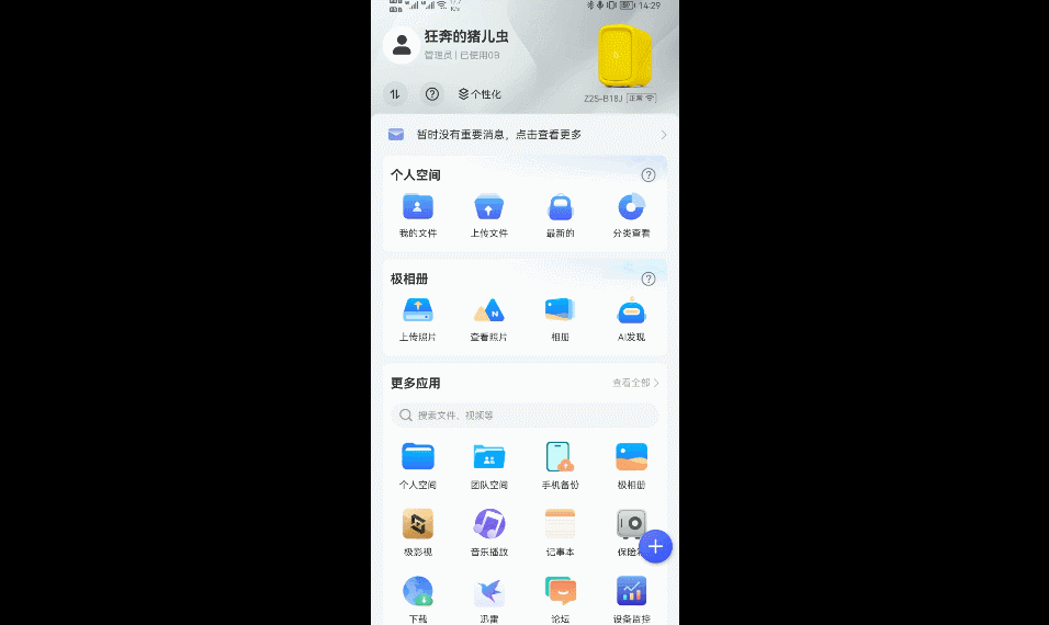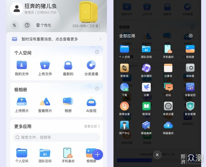 一切就绪后自动进入到极空间APP的主界面,可以说整个APP首页观感设计非常的清爽,功能分区也非常的明确,功能繁多的应用区做了抽屉式处理,点击更多即可查看全部的应用功能,不得不佩服极空间把国人对家用NAS的需求研究的太透彻了,真的是要啥功能有啥功能!