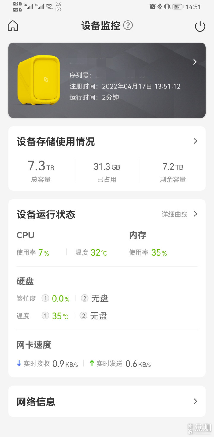 在比较关键的硬件信息管理方面,极空间的“设备监控”功能可以让你对当前设备的CPU、硬盘以及网络等工况信息一览无遗,右上角还提供了软件层面重启和关闭的功能开关,非常便捷!