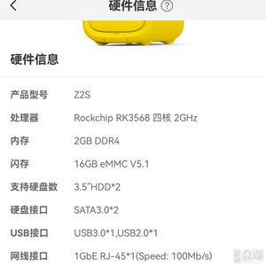 先给极空间Z2S自报一下家门,让大家先了解一下这款家用NAS的各个硬件参数信息,这样观看评测内容前大家就会对这款产品的硬件有一定的了解。主芯片方面Z2S搭载了来自于瑞芯微的A55四核心处理器,在综合性能上较极空间上代产品 Z2 提升了约50%,这款瑞芯微A55的GPU部分采用了Mali-G52图形引擎并且还内置了非常火的NPU处理器,使得Z2S在图像及视频处理方面会更加强悍;其他配置上,我拿到的产品是2GB的DDR4内存以及16GB的闪存版本,厂家还提供了4GB内存的docker版本供更加极致的NAS玩家选择。