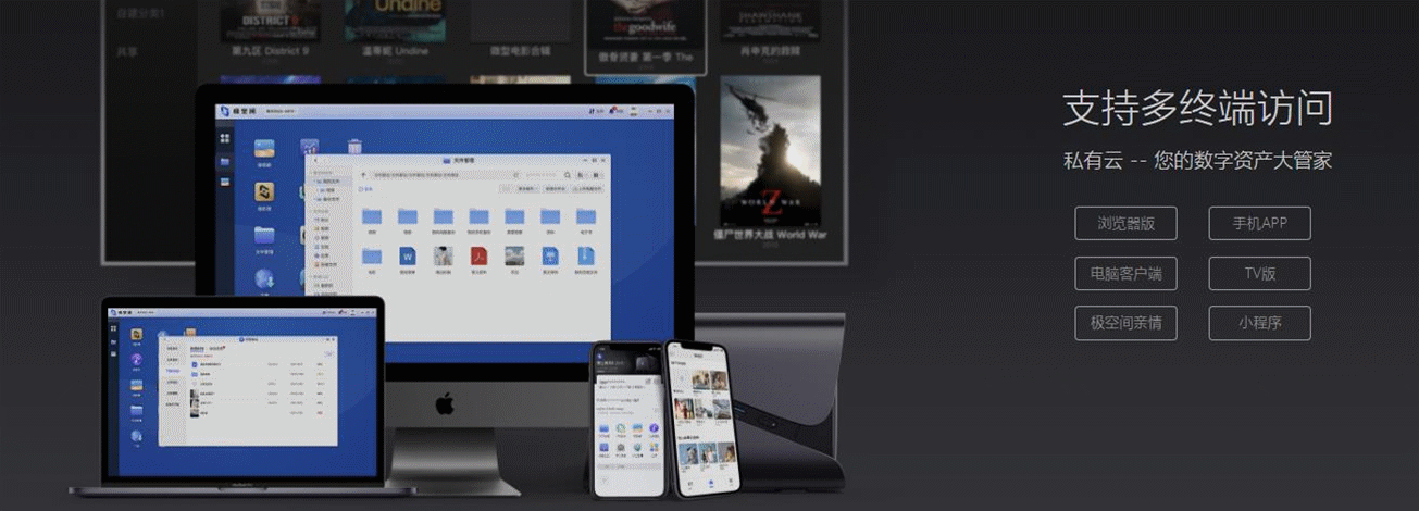 先从平台覆盖开始说吧,和别的NAS产品支持的平台相比较,极空间支持的平台用一个词来形容就是“饱和式支持”,除了传统的PC端Windows+MacOS、移动端IOS+Android之外还有电视端的TV版本,跨平台的浏览器版本,甚至还有小程序版本等等,对于上了年纪的家人还有专门的亲情版APP提供,真的是饱和式的支持!