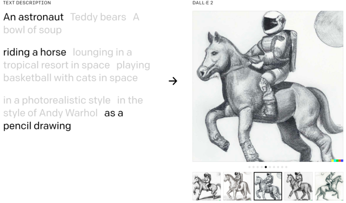 以往对于 DALL·E 2 的测试通常是把一些具体的物体组合成一幅图像,比如图像中包含「骑着马的宇航员」,DALL-E 2 轻松就能完成这个任务: