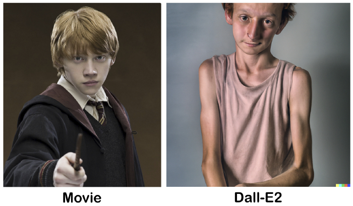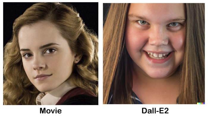 或许你觉得这两个形象大相径庭,并且因为艾玛 · 沃特森的颜值偏爱电影版一些,但不得不说,DALL·E 2 的生成结果是符合原著描述的。