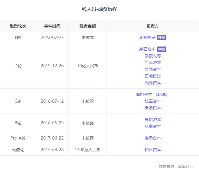 天眼查显示,钱大妈成立于2012年,最近一次D轮融资发生在2019年,融资金额达10亿元,由基石资本领投。