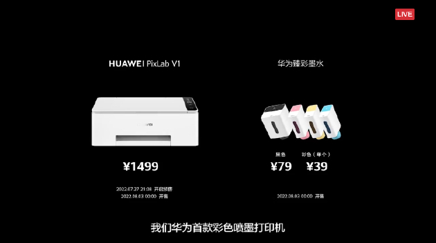 华为PixLab V1彩色喷墨多功能打印机定价1499元起,7月27日预售,8月3日正式开售。