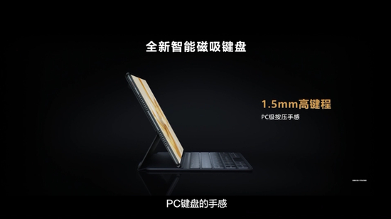 华为还推出了全新分体式智能磁吸键盘,让平板电脑拥有笔记本、分体、创作三种形态,还有配套的磁吸笔套,用于收纳手写笔。