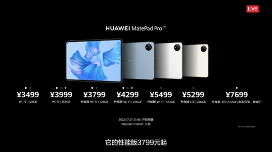 最后是新品价格,HUAWEI MatePad Pro售价3499元,7月27日预售,8月前0日正式开售。