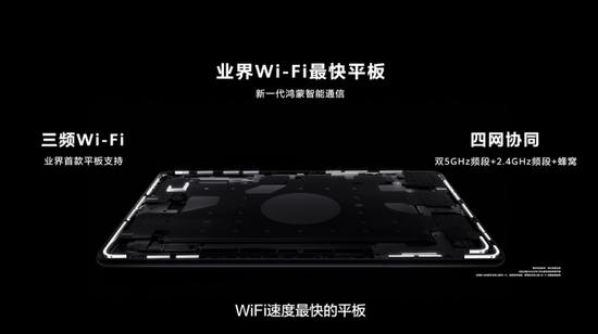 续航方面,HUAWEI MatePad Pro内置8300毫安时容量电池,支持66W超级快充,号称30分钟可充电55%,66分钟即可充满。新品还支持三频Wi-Fi 6的平板(Wi-Fi双5GHz频段+2.4GHz频段),可以四网并发。