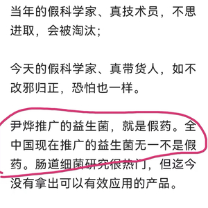 最近几年,专家说话几乎快成雷区,雷语横出。比如,最近国内某专家就说:“尹烨推广的益生菌就是假药,全中国现在推广的益生菌无一不是假药”、“迄今没有拿出可有效应用的产品”,几句话几乎打翻一个行业,国内数十年的益生菌研究成果被一笔抹杀。