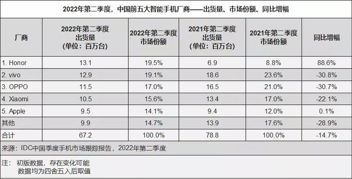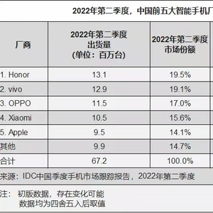 2022年第二季度,中国智能手机市场出货量排名前五的厂商分别为:荣耀、vivo、OPPO、小米、苹果。