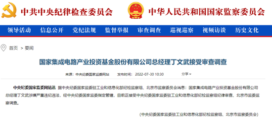 据中央纪委国家监委网站,中央纪委国家监委驻工业和信息化部纪检监察组、北京市监察委员会消息:国家集成电路产业投资基金股份有限公司(以下简称“大基金”)总经理丁文武涉嫌严重违纪违法,经中央纪委国家监委指定管辖,目前正接受中央纪委国家监委驻工业和信息化部纪检监察组纪律审查、北京市监委监察调查。