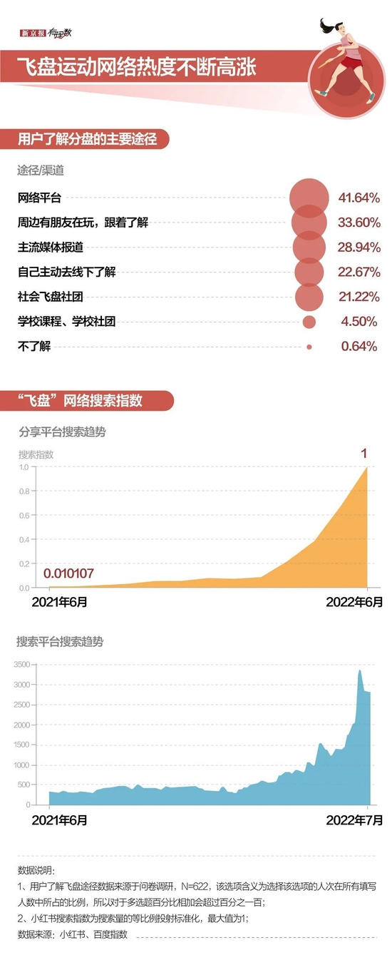 据某头部分享平台数据显示,今年4月与2021年同期相比,飞盘的相关搜索量增长了30倍,5月同比增速扩大62倍。社区小广场、公园、足球场……但凡有块空地,就有上蹿下跳扔飞盘的身影,越来越多人关注、了解飞盘。搜索平台“飞盘”的搜索指数更是在7月7日达到顶峰(国家体育总局通知拟举办飞盘联赛)。