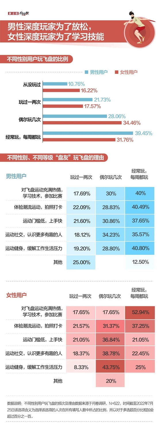 为什么这么多人喜欢玩飞盘,我们做了一个调研,发现在所有“盘友”(这里定义玩过飞盘即“盘友”)里,男性玩家玩飞盘的频次远高于女性。