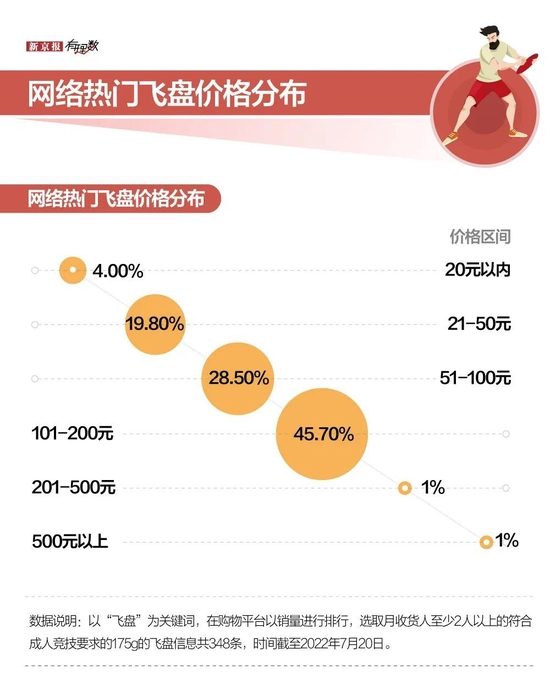 而飞盘,一般爱好者最大的投入可能就是入个盘,顶多再买双鞋。所以很多商家都在飞盘上发力,私人定制、联名款、跨界IP等各类盘层出不穷。通过分析网购平台热门飞盘发现,多数飞盘的价格集中在100-200元以内,单价并不算高。