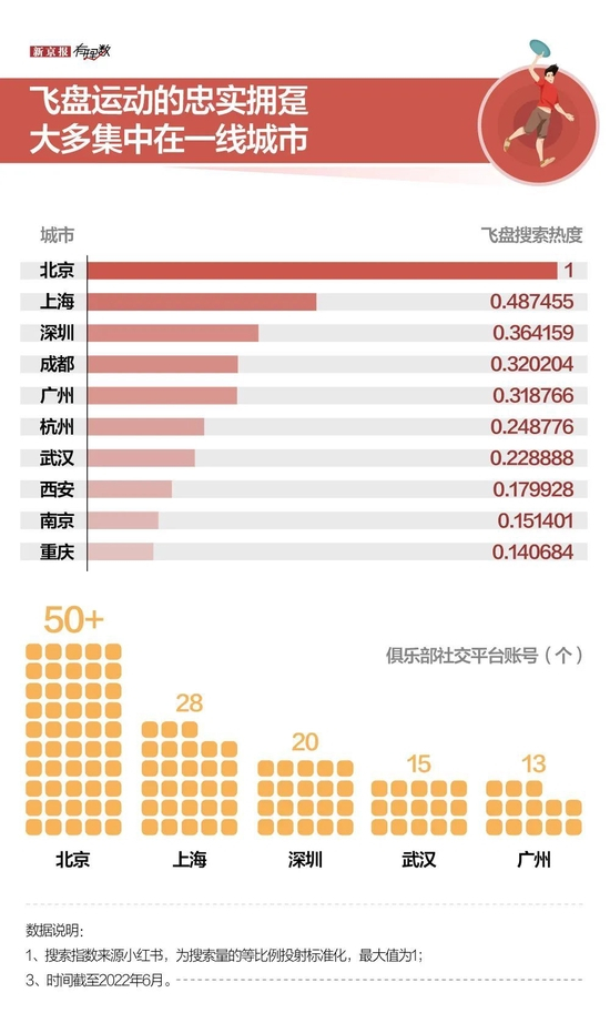 据业内人士介绍,2019年之前,全国飞盘俱乐部才不过50多家,而现在仅北京就有150多家,目前入驻分享平台的俱乐部里北京有至少50家,紧跟其后的上海有近30家。