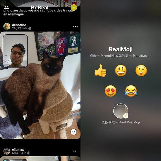 首先是真实。Be Real不能选相册照片,只能直拍发送原图,而且是前置/后置摄像头同时拍,甚至重拍次数也会记在详情中。此外,Be Real只有一个互动功能RealMoji,和普通的点赞评论不同,这里用户可以选择一个 emojl 表情模仿拍照,点的赞会用自己的表情代替emoj。
