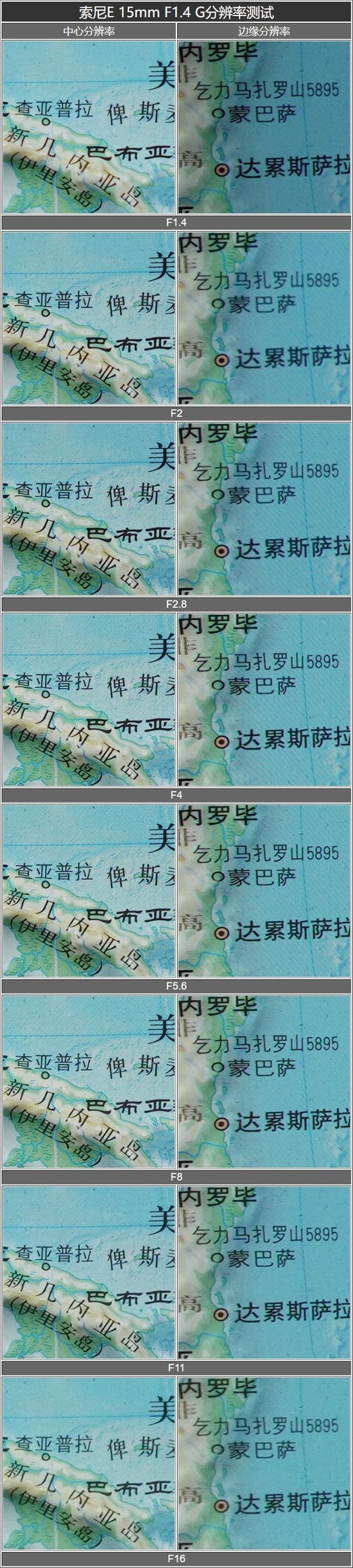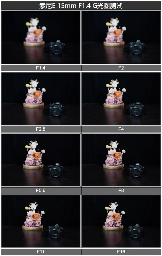 从测试图表中可以清楚看到不同光圈下背景虚化效果的不同。索尼E 15mm F1.4 G在F1.4光圈全开的情况下,背景的虚化非常柔美漂亮。
