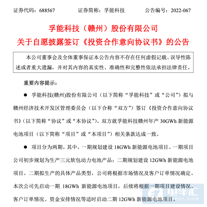 电车汇消息:8月1日晚,孚能科技发布公告称,孚能科技(赣州)股份有限公司拟与赣州经济技术开发区管理委员。双方就孚能科技赣州年产30GWh新能源电池项目相关条款达成一致。