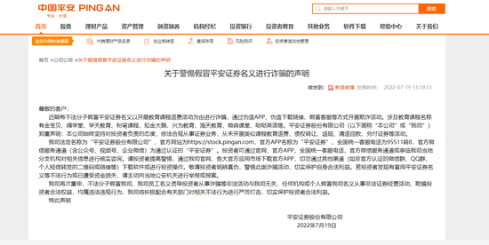 早在7月19日,平安证券就发布了一则《关于警惕假冒平安证券名义进行诈骗的声明》公告,明确指出近期有不法分子假借平安证券名义以开展教育课程退费活动为由进行诈骗,通过伪造App、伪造下载链接、假冒客服等方式开展欺诈活动。