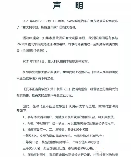 值得注意的是,2021年欧洲杯期间,斯威汽车官方曾发布“意大利夺冠,斯威退车款”相关活动。其中一项活动内容是:意大利队欧洲杯夺冠,凡是参与有奖竞猜活动的用户都有机会抽取斯威钢铁侠一台。巧合的是去年欧洲杯夺冠的正是意大利球队。