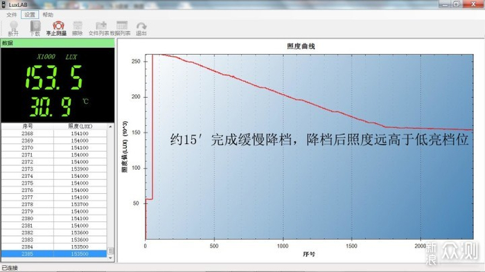 开启极亮后,TH30R即开始缓慢降档,过程比较长且连续,肉眼觉察不出亮度的均匀变化,经历了15分钟开始恒定输出,此时照度仍高于低亮约3倍,大致为300lm可以持续使用。