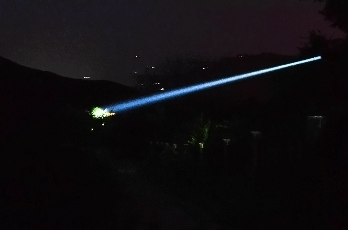 在开阔的户外,TH30R的照明有清晰的光柱效果,出筒光线非常汇聚,向前略收缩变小,其后在透视效果的作用下,看不出光线的发散,就笔直地冲向夜空的尽头。