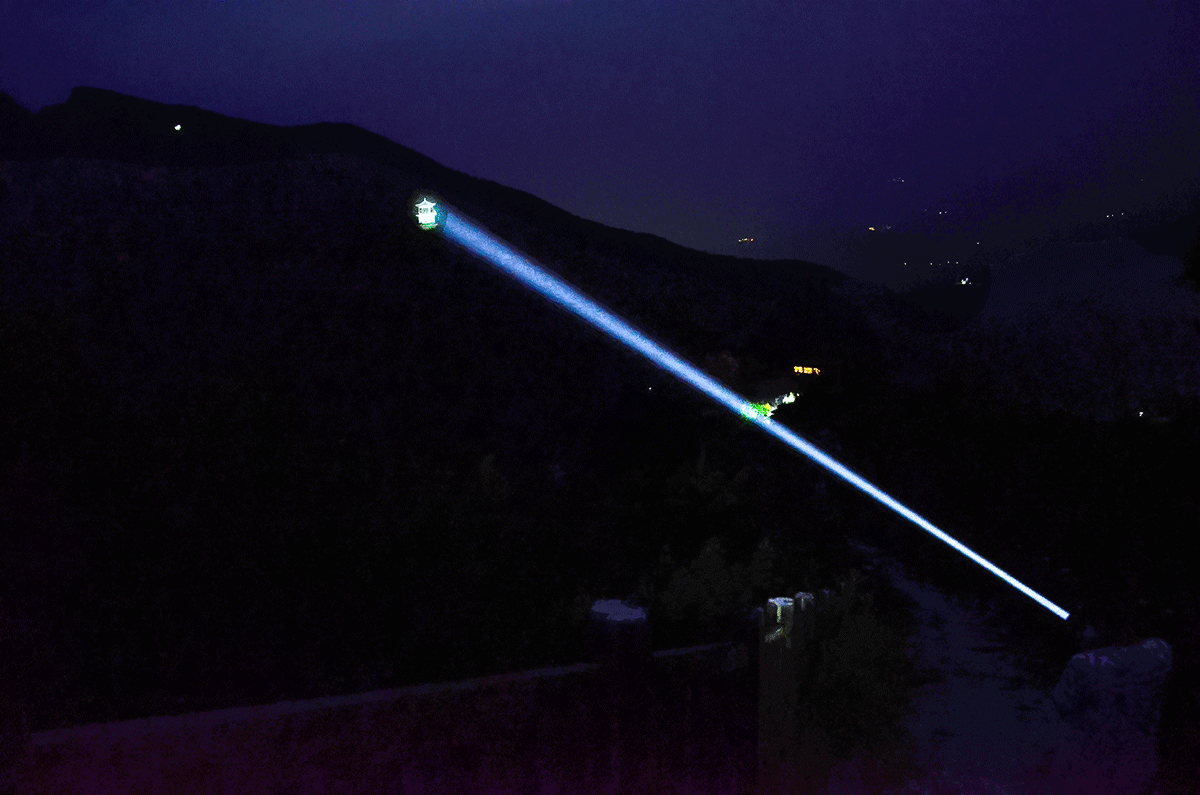 白激光手电是近两年照明技术发展的产物,以其准直的照明效果,以及超远的照射距离而著称,黑夜看,宛如一道笔直的光剑,将黑夜撕开一道缺口,跨越山河大海,只为看清更远的世界。