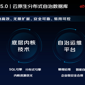 在底层内核技术方面,5.0新版本主要实现了分布式事务,分布式控制语言,分布式服务治理能力和SQL全局索引四大功能,新功能的实现提升了分布式集群的服务稳定性,可用率可达99.99%,整体的查询性能提升200%。