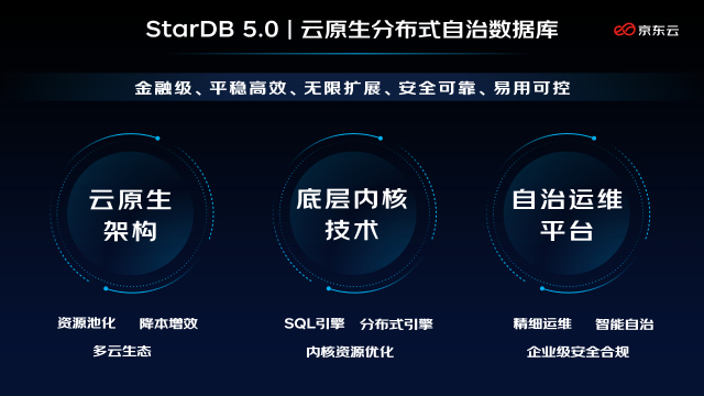 据介绍,京东云StarDB起源于京东内部业务需求,整体可分为企业级数据库、金融级分布式数据库、自研国产分布式数据库以及云原生分布式自治数据库四个发展阶段。本次新发布的StarDB 5.0,在云原生架构、底层内核技术、自治运维平台方面做了全面升级。