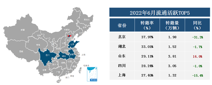 2022年6月,全国转籍比例排名前五的省份是北京、湖北、山东、四川、上海。其中仅山东省转籍量较去年同期有所增长,二手车转籍量分别为3.81万辆,较去年同期增长了16%。其余四个省份均有不同程度下降,北京降幅最为明显,较去年同期下降了31.3%,其次是上海,同比下降了15.4%。湖北和四川两省较去年同期也有小幅的下降。