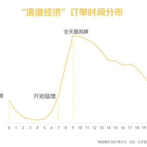 据美团外卖数据显示:今年520同比去年520,节日礼赠相关商品销量增长300%;今年214环比去年七夕,销量增长102%;而同比去年214,涨幅高达625%。疫情防控以来,“外卖买万物”已成为越来越多人的消费购物新选择。从订单下单时间统计分析来看,浪漫型节日当天,0点-1点,成第一个送礼高峰,随后订单量回落。早上7点后,订单量直线拉升,9-11点成为全天订单最高峰时段,占全天订单量近三成。