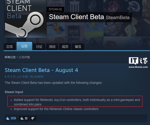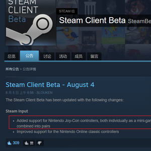 根据 Steam 官方发布的公告,Steam 客户端测试版已支持任天堂 Switch Joy-Con 手柄。