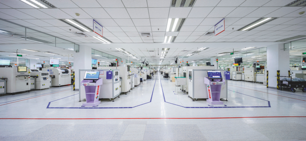 不过,近期这座往年在高峰期用工规模近1.97万人的工厂却没有往日热闹,数控中心实时同步的9块屏幕里,只能偶然瞥见穿着红蓝防静电服的工人。到了饭点,中区的食堂也不拥挤。作业人员减少,一方面是因为智能工厂本身,另一方面则是市场遇冷以及芯片供应不足。