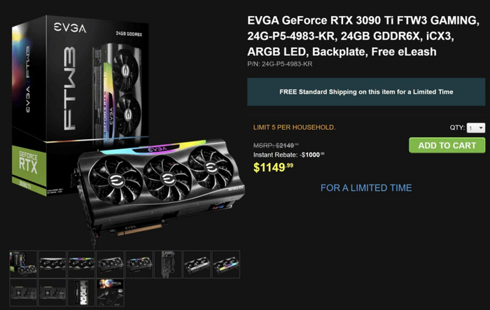 EVGA 高级定制设计的 GeForce RTX 3090 Ti FTW3 显卡标价 2149.9 美元,现在降价 1000 美元,售价 1149.99 美元(约 7785.43 元人民币),几乎是原价的一半。