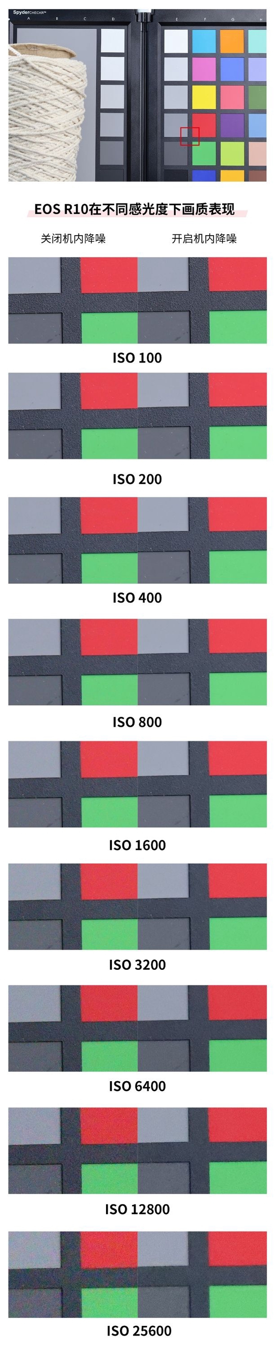 从实拍截图来看,佳能EOS R10在关闭机身降噪时,在ISO 100-6400内的画质比较纯净,虽然在ISO12800出现了彩色噪点,但仍有一定的可用度,而更高的ISO时噪点也相应增加。以上是关闭机身降噪时得出的结果,这样的表现比较符合我们的预期。而通过我们开启机身降噪的测试结果也可以看到,此时佳能EOS R10的感光度表现可以说提升了两个档次,12800以下都比较纯净,25600也有一定的可用度,考虑到现在的机内降噪也已经十分成熟,关闭机身降噪拍摄反而是徒增烦恼。