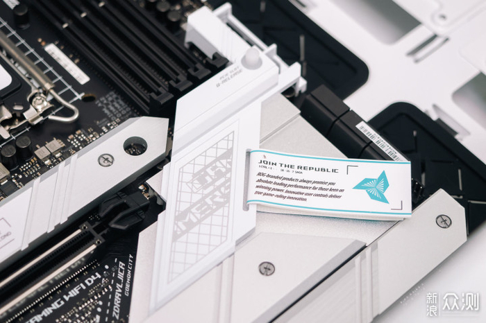 易拆键,玩家只需要按下按钮,就可以轻松解锁显卡的PCIe插槽的锁定扣。下方还有个十分个性的扎线带,很值得一提的是ROG Z690吹雪D4版和D5版的这个扎线带,印花是不一样的,不知道各位留意到没有。