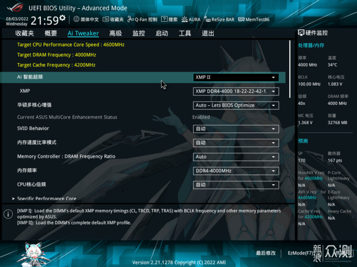 比较值得一提的是,ROG的主板都会有的功能:AI智能优化2.0,如果是不太擅长超频的盆友,可以选择使用这个功能辅助超频。让我没想到的是,吹雪系列现在还有定制化的BIOS界面了,在工具→Choose your bockground scene里切换,切换之后开机的主视觉都会变成吹雪妹妹,很有意思的小细节。