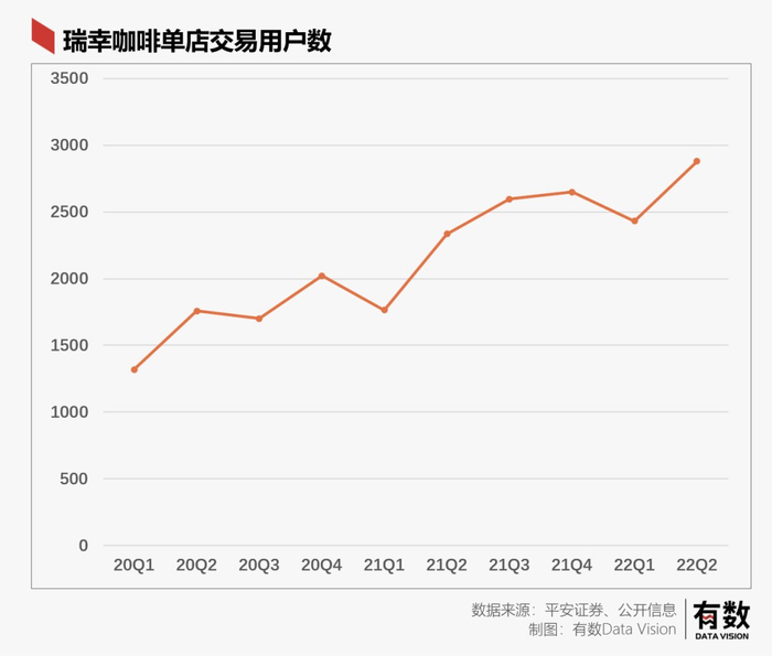 单店交易用户数则在这次的财报中再次创下新高,达到2879人,这其实就是在厚乳系列、生椰拿铁、椰云拿铁……这些不断接力的爆款所带来的高复购和增长所取得的成效。